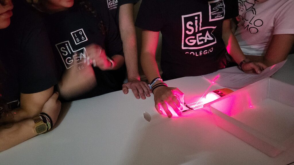 O 8.º ano observou reflexões em espelhos côncavos e convexos e observou a vergência de lentes convergentes e divergentes com diferentes curvaturas.