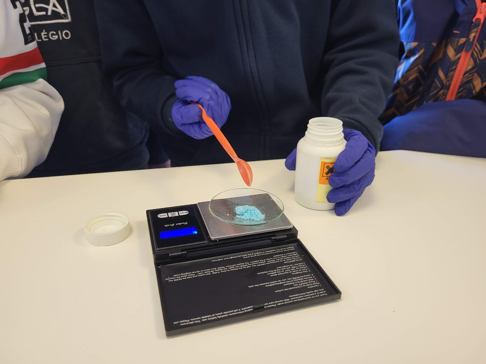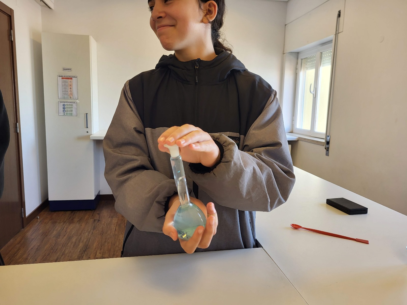 A turma do 7.º ano de Físico-Química esteve no laboratório a preparar uma solução se sulfato de cobre, ao mesmo tempo que identificava pictogramas de perigo e o material de laboratório mais comum.