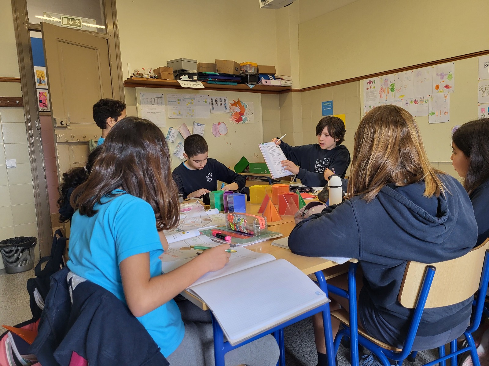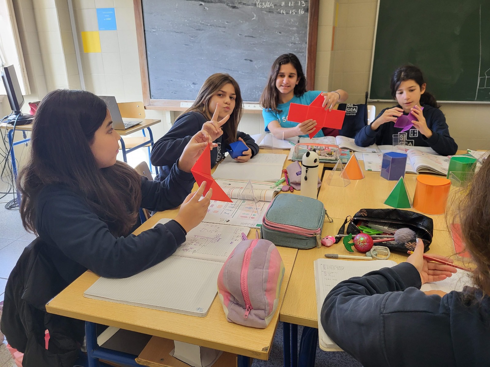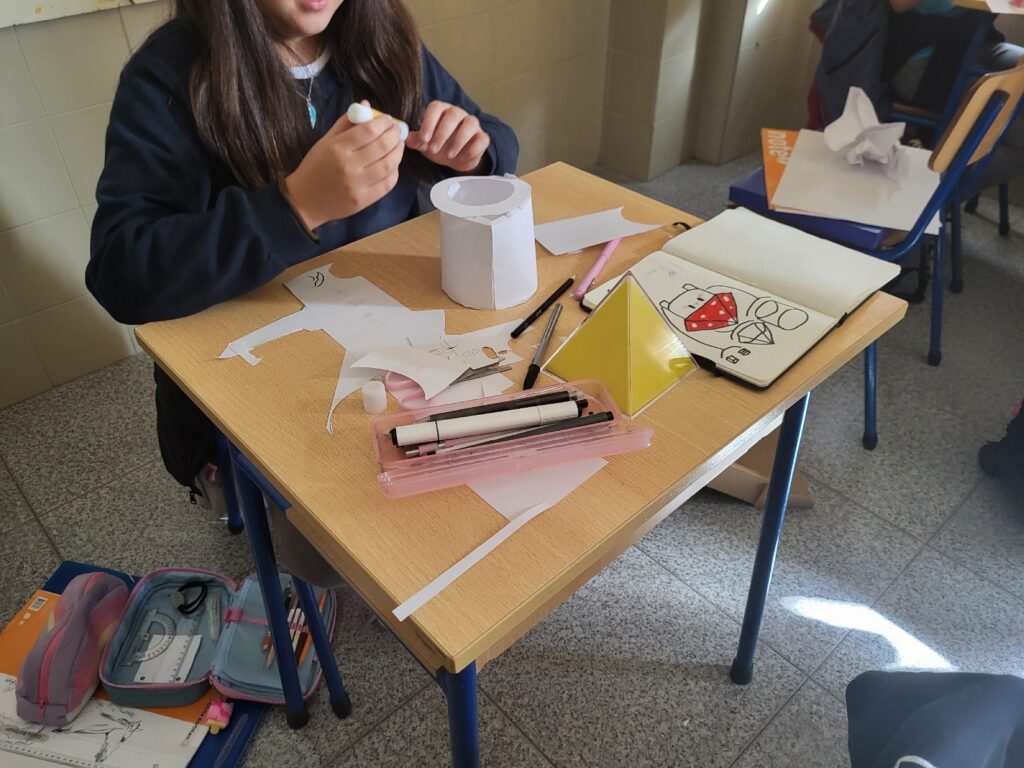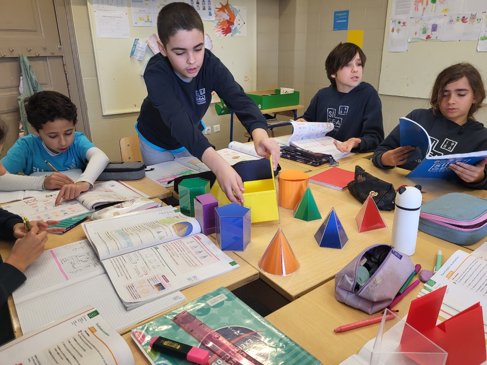 Os alunos do 5.º ano de matemática estiveram a aprender a planificar sólidos geométricos. Primeiro desmontaram sólidos e discutiram as caraterísticas das planificações de prismas e pirâmides. Depois foi tempo de cada um desenhar a sua própria planificação e construir a partir dela um sólido geométrico.